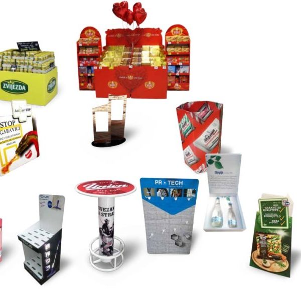 Atraktivnim izgledom i grafičkim dizajnom naši pos displeji privlače veliku pažnju kupaca, a mogu biti u raznim oblicima kao što su: podni displeji, stolni stalci, viseći displeji, paletni omotači i ostrva, promo kutije, pultevi, totemi, senzormatici I sl. Mogu biti od različitih vrsta materijala kao što su karton, plastika, metal i drvo.